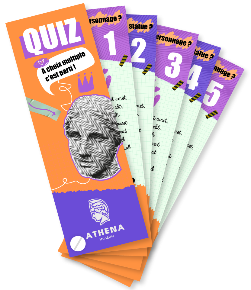 Dans un musée, l’éventail classique devient un support pédagogique ludique. Chaque volet peut contenir une question à choix multiple, une anecdote ou un indice lié à une œuvre. Les visiteurs le manipulent au fil de leur parcours, découvrant les réponses étape par étape. Nous avons créé un Éventail Classique sur-mesure en guise de quiz autour d’une collection de sculptures. Les familles et les plus jeunes visiteurs s’approprient immédiatement ce support, qui rend la visite interactive et mémorable. Loin d’un simple dépliant, l’éventail engage, stimule la curiosité et crée un lien plus fort avec votre institution.