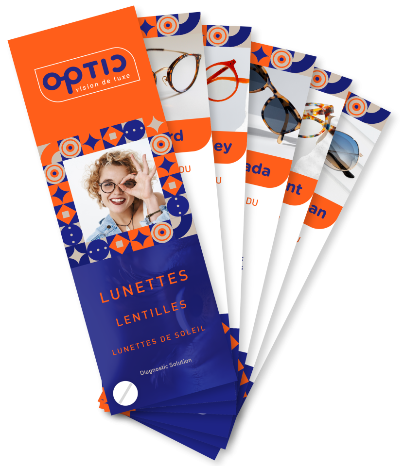 En boutique, l’éventail peut également se transformer en élégant catalogue. Pour un opticien par exemple, chaque volet peut présenter une monture différente, avec sa photo, son nom et ses caractéristiques. Les clients comparent, découvrent et choisissent leurs modèles en feuilletant un objet original, bien plus attractif qu’une simple plaquette. Ce support valorise les produits mais aussi l’image de marque. Travaillé par nos graphistes, il reflète immédiatement le sérieux et l’expertise de l’opticien. En boutique, il facilite l’échange avec le client ; emporté à la maison, il prolonge l’expérience et devient une aide à la décision d’achat.