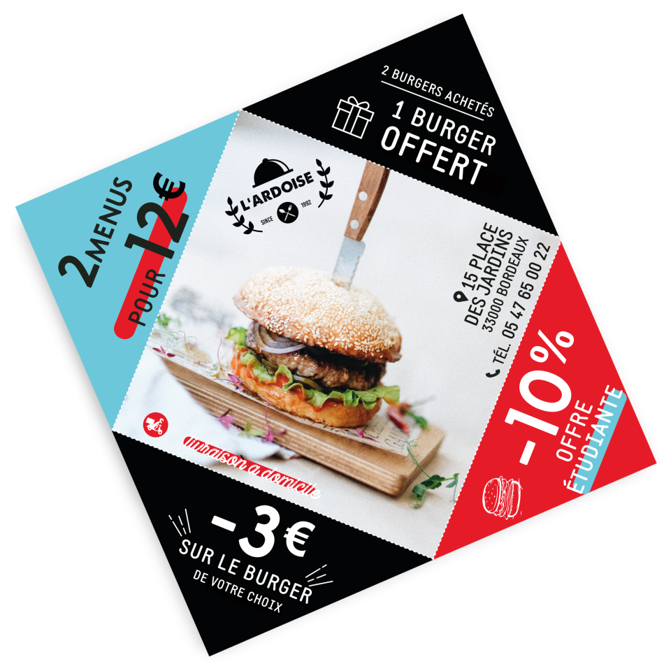 Dans la restauration rapide, tout va vite, y compris la prise de décision du client. Le Cut Corners s’intègre parfaitement à cette logique. Grâce à ses quatre coupons détachables, il permet de proposer plusieurs mécaniques promotionnelles sur un seul support, sans alourdir le message. Une offre immédiate, comme une remise ou un produit offert, peut cohabiter avec une incitation à revenir, par exemple sur un menu ou une formule spécifique.
