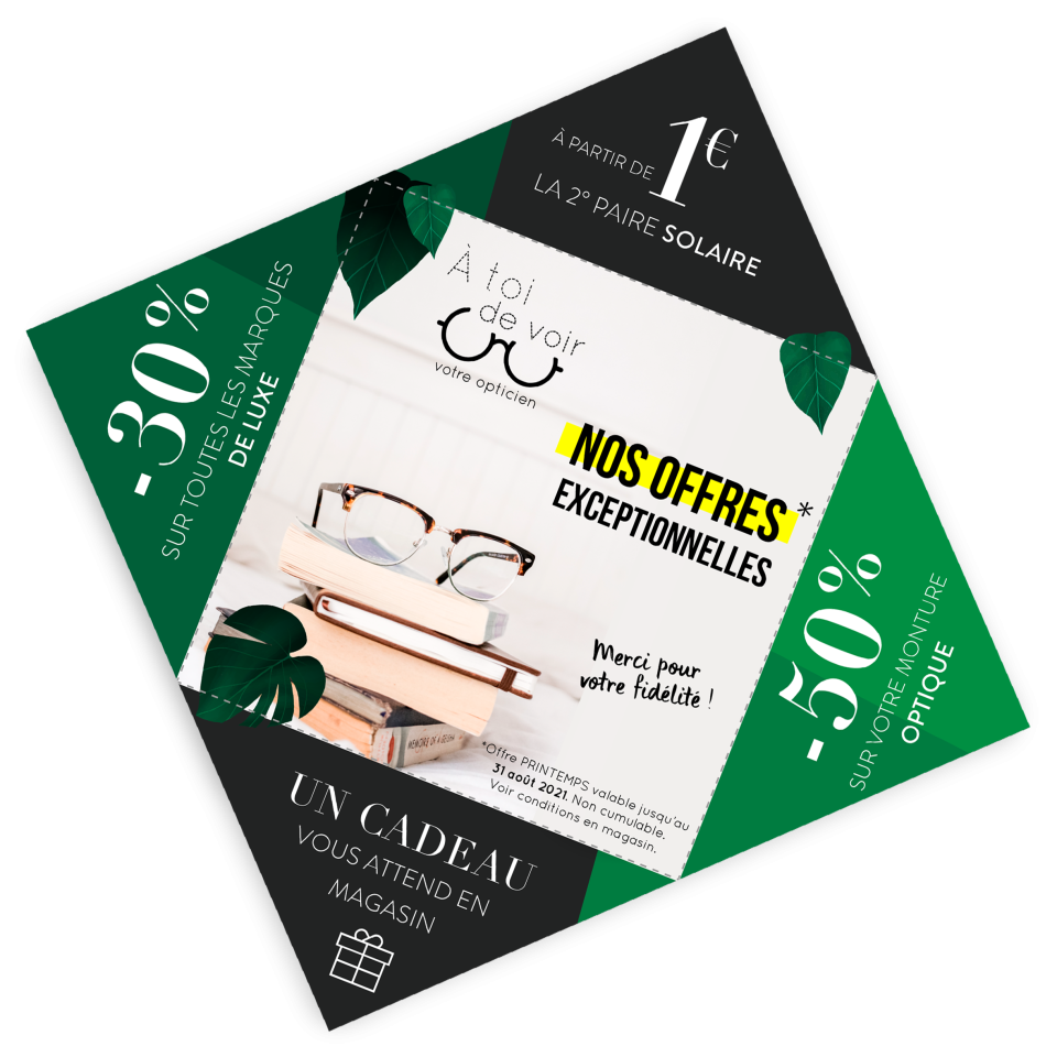 Le secteur de l’optique repose sur la confiance. Le Cut Corners s’adapte parfaitement à cette exigence en proposant plusieurs avantages ciblés sur un même support, sans dégrader l’image de marque. Une remise sur les montures, un avantage sur les verres, une offre dédiée aux solaires ou un cadeau récompensant la fidélité peuvent être réunis de manière élégante et cohérente.