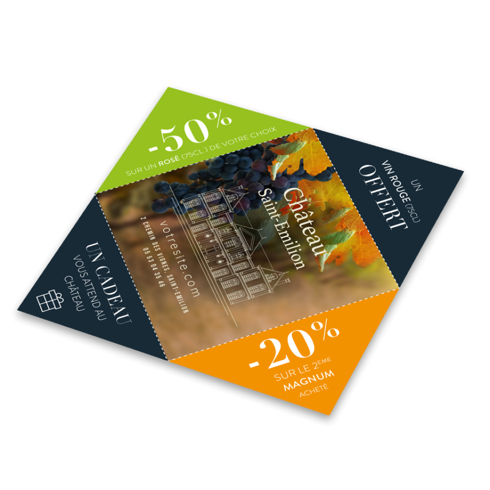 Pour les vignerons, la promotion raconte une histoire, valorise un terroir et entretient la relation avec l’amateur de vin. Le Cut Corners permet de combiner ces enjeux en un seul support. Chaque coupon peut correspondre à une offre précise, comme une remise sur une bouteille, un avantage sur un format magnum ou un produit offert pour encourager l’achat multiple.