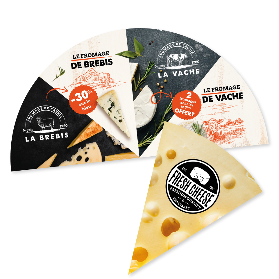 Dans un registre plus artisanal, le Demi-Lune devient un formidable écrin pour les fromagers. Ici, la forme circulaire évoque immédiatement les meules de fromage, renforçant la cohérence visuelle. Chaque portion peut mettre en avant une typologie de produit : fromage de brebis, de vache, spécialités locales, promotions… L’ouverture progressive permet de raconter une histoire, celle de votre savoir-faire, de vos producteurs ou encore de vos engagements qualité.