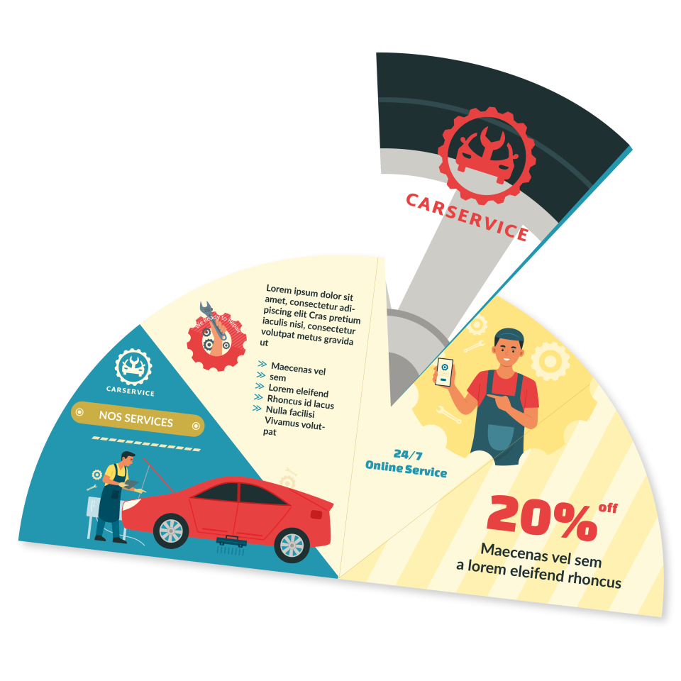 Le secteur automobile n’est pas forcément celui où l’on attend le plus de créativité print… et c’est justement là que le Demi-Lune fait toute la différence ! Imaginez un dépliant reprenant la forme d’une roue ou d’un compteur. Dès le premier regard, l’univers est posé. Chaque segment peut correspondre à un service : révision, vidange, pneus, diagnostic, réparation… L’ouverture progressive permet de détailler vos prestations de manière claire et structurée.