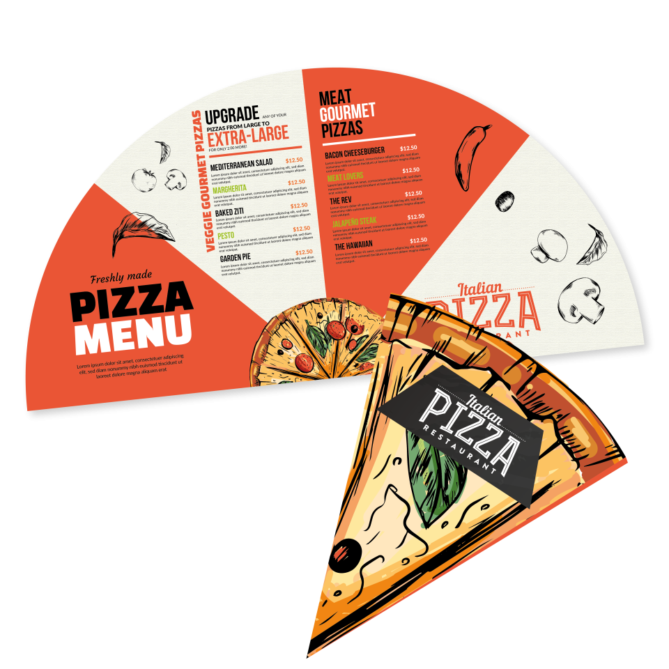 Difficile de faire plus évident… et plus efficace ! Le dépliant Demi-Lune se prête parfaitement à l’univers de la pizza. En reprenant la forme iconique d’une part, vous créez instantanément une connexion visuelle avec votre produit. Chaque segment peut représenter une pizza différente ou une catégorie de votre carte. Au fil du dépliage, votre client découvre vos recettes, vos ingrédients, vos prix, mais aussi vos offres spéciales. Le geste d’ouverture devient presque instinctif, comme celui de partager une pizza entre amis.