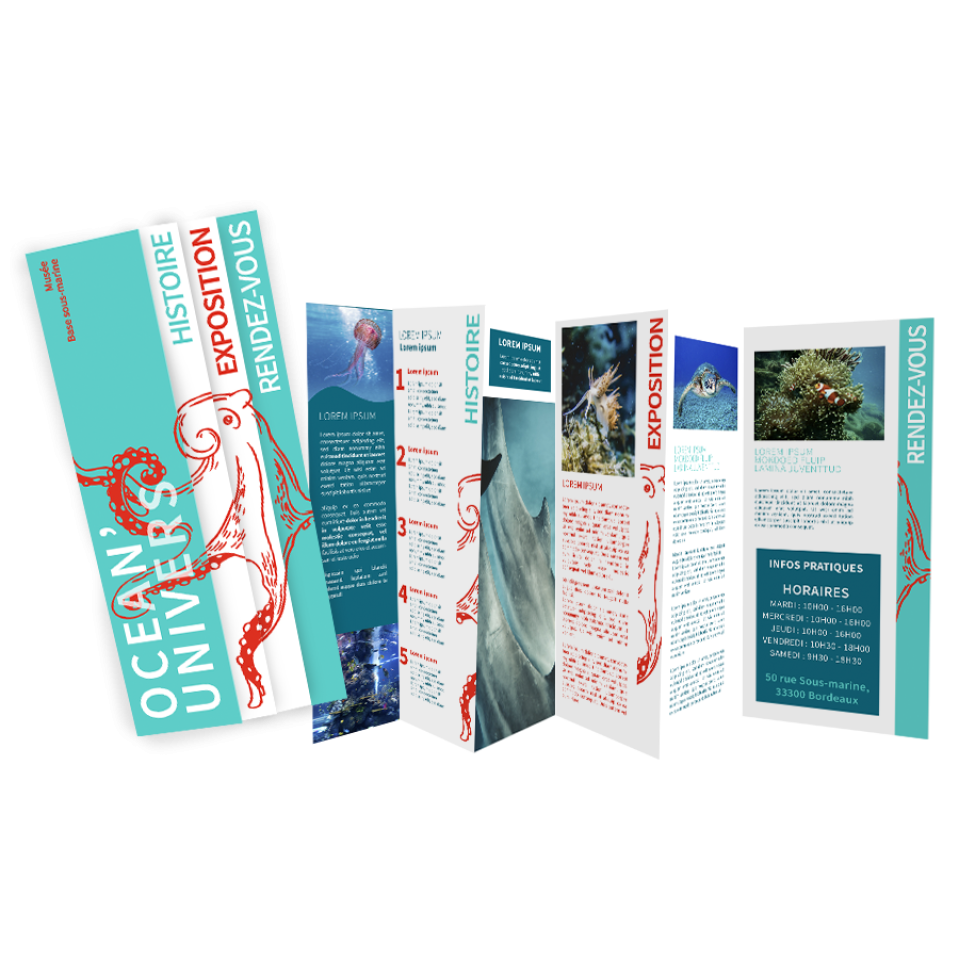 L’univers marin est synonyme de découverte, d’émerveillement et de pédagogie. Pour retranscrire cet imaginaire, rien de tel qu’un dépliant qui se déploie à la manière d’une véritable plongée progressive dans les fonds marins. Nous avons ainsi accompagné un aquarium dans la conception de son Plis Décalés, pensé comme une invitation à voyager. Dès la couverture, un visuel graphique et coloré capte l’œil, puis chaque ouverture dévoile une étape de l’expérience : l’histoire de l’aquarium et son lien à l’océan, les espèces emblématiques à découvrir, les expositions temporaires et enfin les informations pratiques.