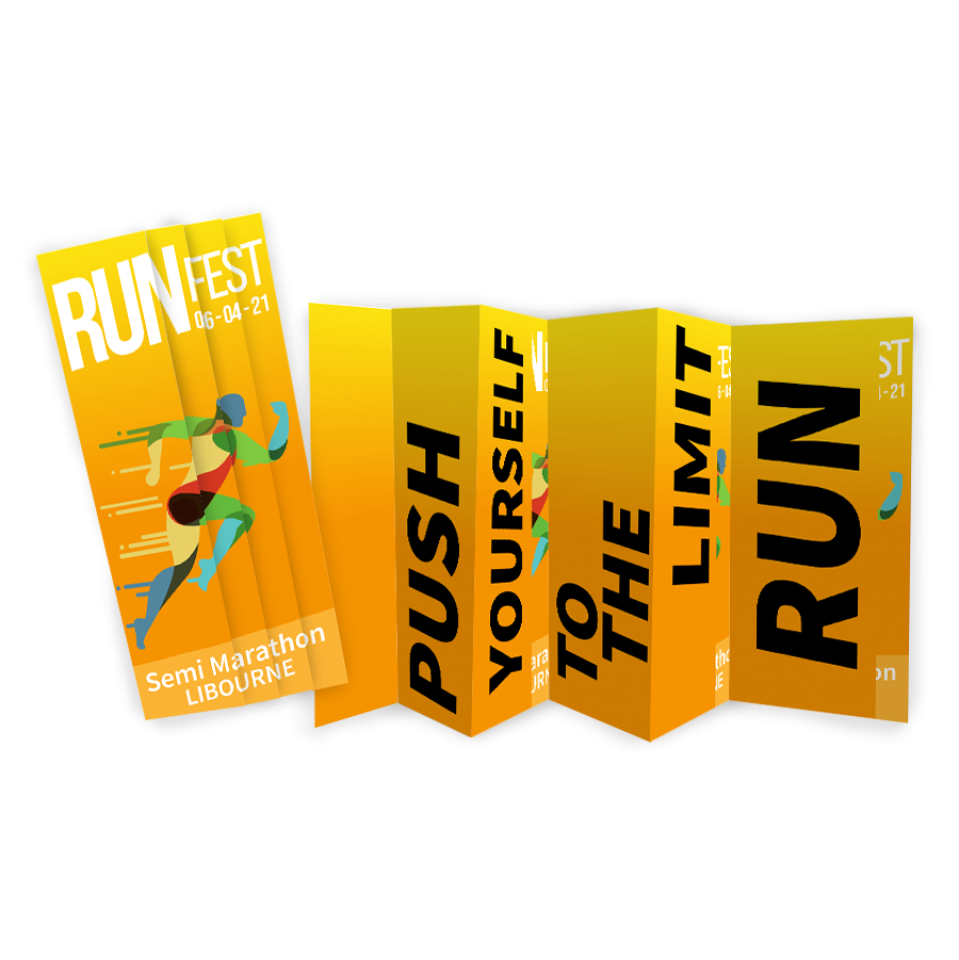 Nous avons par exemple conçu un modèle dédié à un événement sportif régional, où chaque pli faisait découvrir une nouvelle facette de la manifestation. Le premier volet donne le ton avec une identité visuelle forte et impactante, tandis que les pages suivantes déroulent progressivement les informations pratiques : parcours, horaires, animations, partenaires… Le format en zig-zag permet ainsi une lecture fluide, presque comme un compte à rebours qui mène à l’événement lui-même. Ce choix de support s’avère particulièrement efficace pour inciter à la participation et générer de l’engouement. Dans un contexte où les supports de communication doivent à la fois informer et enthousiasmer, le Plis Décalés permet de transmettre l’énergie de votre événement dès la première manipulation.