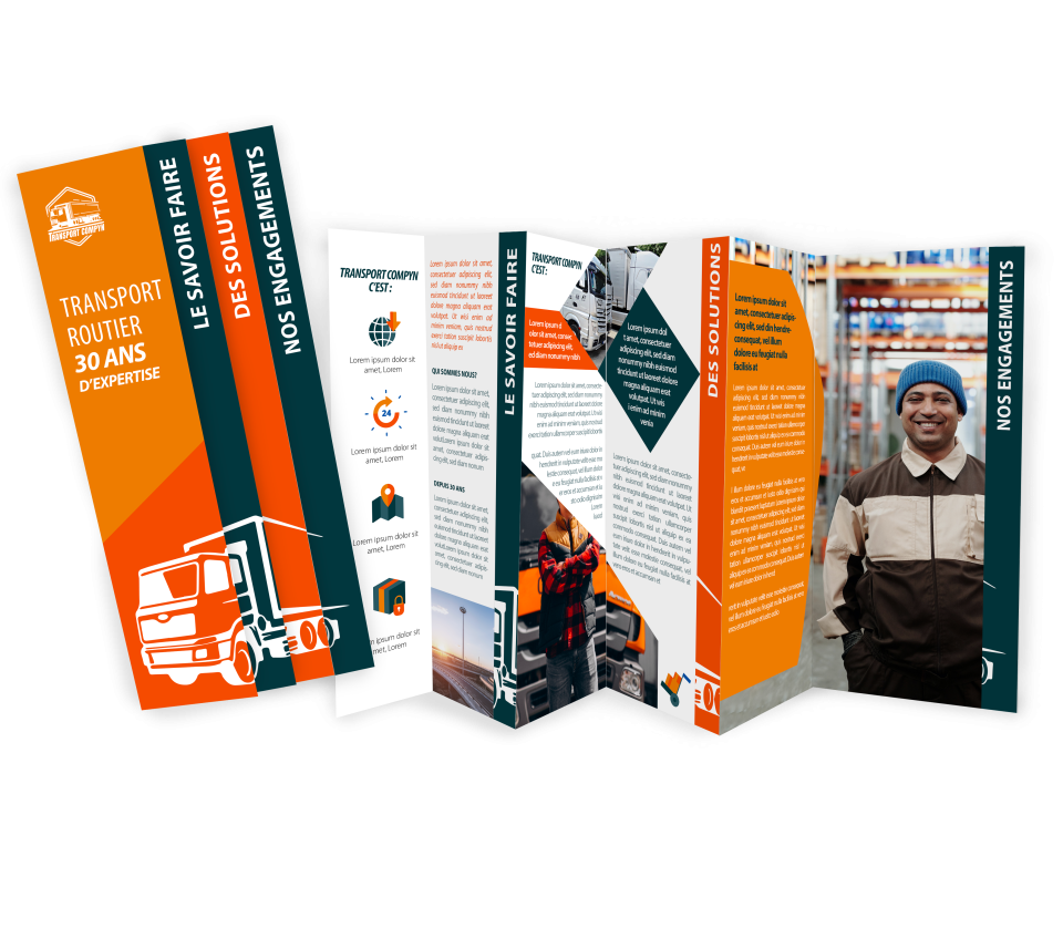 Dans le secteur du transport routier, la crédibilité et la clarté du message sont essentielles. Le Plis Décalés se transforme alors en outil de présentation stratégique. Nous avons travaillé avec une entreprise familiale forte de 30 ans d’expérience dans le domaine. Son Plis Décalés présentait tour à tour son savoir-faire, ses solutions logistiques et ses engagements en matière de sécurité et d’environnement. Chaque volet du dépliant offrait un espace clair et distinct pour valoriser un aspect de l’entreprise, tout en formant un ensemble cohérent.