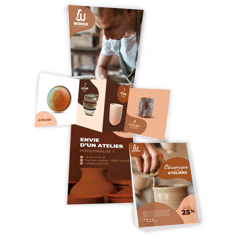 Imaginons maintenant une céramiste souhaitant promouvoir ses ateliers. La couverture du Pop-up Twist présente une photographie de ses créations, accompagnée d’un titre qui annonce le thème : sobre mais percutant, ce visuel suscite la curiosité des amateurs de savoir-faire artisanal. À l’ouverture, l’expérience prend toute son ampleur. Le pli dynamique laisse apparaître quatre encarts illustrés, chacun dédié à un type d’atelier. Chaque catégorie est accompagnée de visuels attractifs et d’une description concise. Les informations pratiques – tarifs, contacts, horaires – trouvent naturellement leur place sans surcharger l’ensemble.