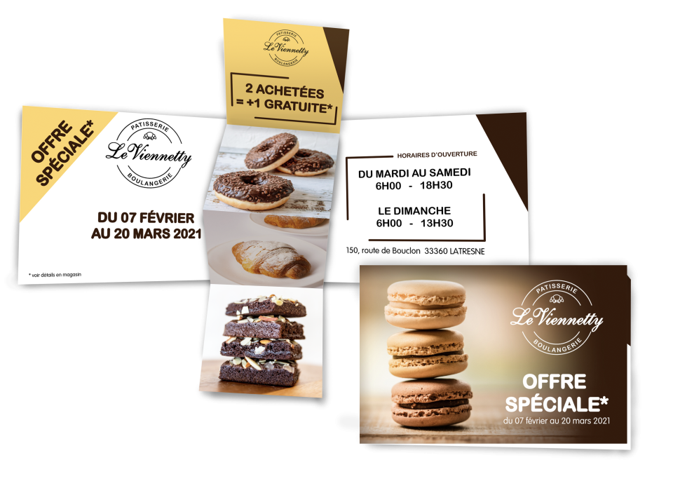 Le même principe s’applique à une boulangerie de quartier souhaitant se démarquer. Sur la couverture, une mise en avant appétissante : une photographie en gros plan de macarons alléchants, accompagnée d’un message accrocheur annonçant une offre spéciale. Ce premier visuel suffit à donner envie de découvrir la suite… À l’intérieur, le Pop-up Twist déploie son relief et transforme le message en véritable vitrine. On y retrouve les détails de l’offre, les dates de validité et surtout des visuels léchés : viennoiseries et pâtisseries. On pourrait presque sentir leurs parfums…
