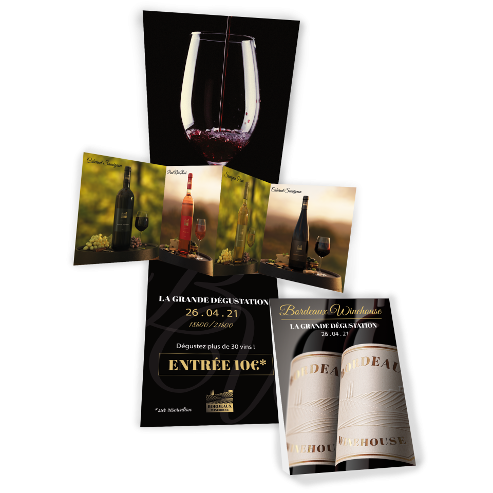 Un domaine viticole prépare une dégustation et souhaite inviter ses clients privilégiés. La première impression se joue dès la couverture : une belle photographie de bouteilles soigneusement mises en scène, accompagnée d’un titre clair qui annonce l’événement. Le prospect tient entre ses mains un support qui ressemble à un élégant dépliant. Mais lorsqu’il l’ouvre, la magie opère…
