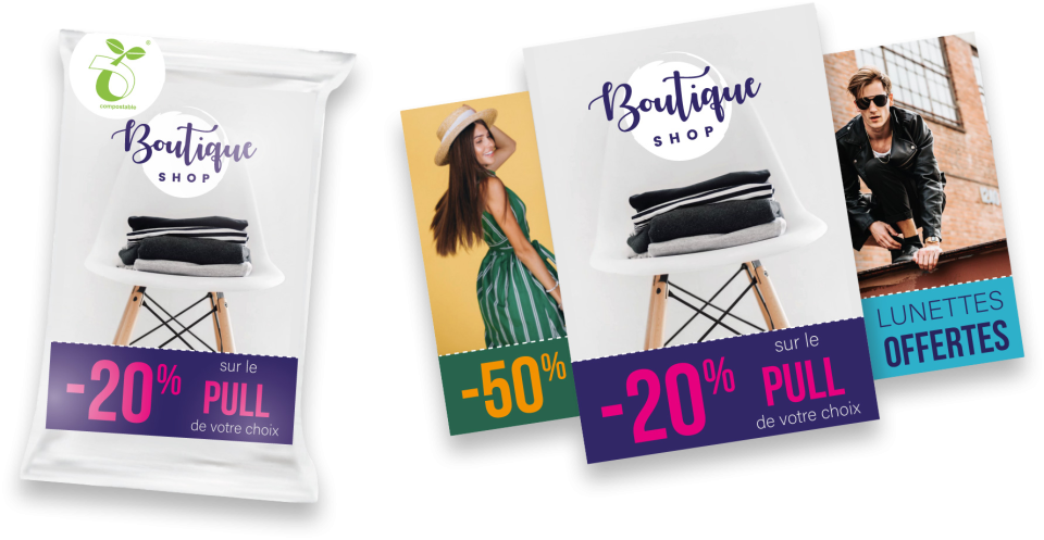 Chaque Pub-Pocket peut contenir 2 à 20 fiches personnalisées en fonction de vos besoins. Et parce que nous inscrivons l’innovation dans une démarche responsable, nous avons remplacé le plastique par un sachet biodégradable en NATIVIA®, issu de résines biosourcées. Opaque, le sachet accentue l’effet mystérieux de votre communication.
