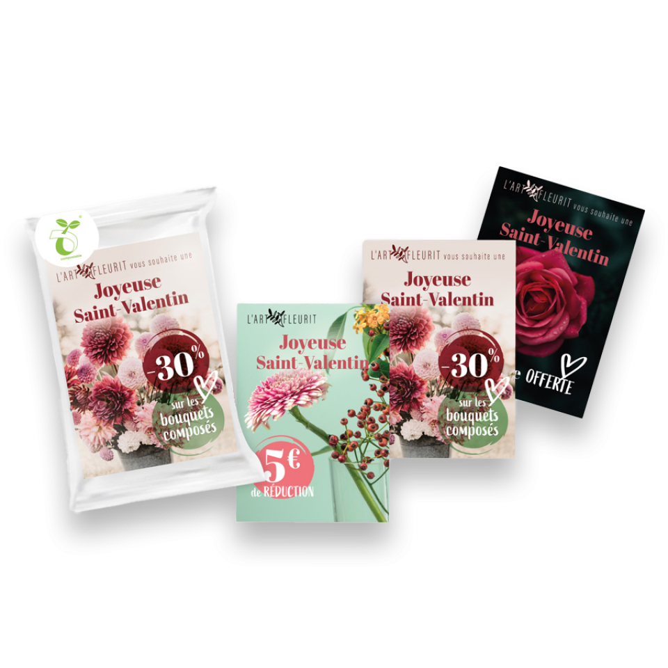 Le Pub-Pocket Fiche peut être présenté à votre comptoire, accroché à un présentoir ou glissé dans un bouquet prêt à emporter. C’est un moyen original de prolonger l’émotion du produit tout en offrant une communication soignée et plus durable. Le sachet NATIVIA® fait également écho à la dimension écologique que recherchent de plus en plus de clients.