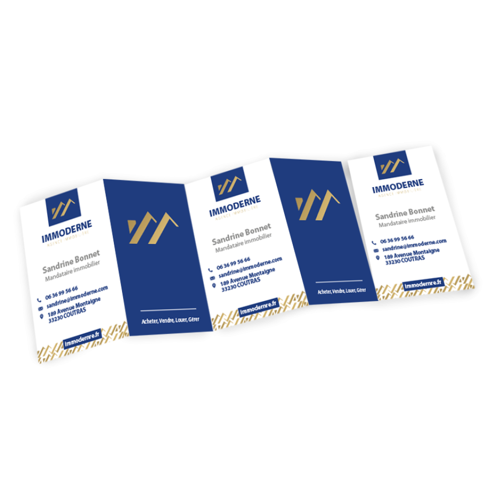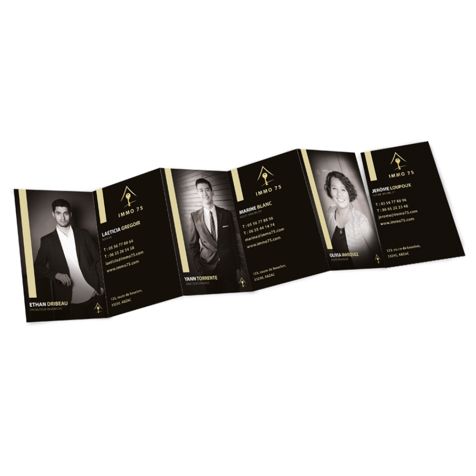 Dans une agence immobilière, chaque collaborateur possède ses propres spécialités, son secteur ou son portefeuille clients. Pourtant, sur le terrain, vous êtes souvent amené à représenter toute l’équipe. Les cartes de visite détachables répondent parfaitement à ce besoin. Sur un même support, chaque volet peut correspondre à un agent différent. Lors d’un échange avec un prospect, vous pouvez ainsi lui remettre la carte la plus pertinente selon sa demande : achat, vente, location ou gestion.