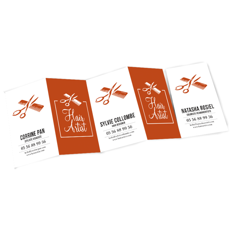 Dans le secteur de la coiffure, la relation client est profondément humaine. Chaque client développe une affinité avec un coiffeur ou une coiffeuse en particulier. Il est donc essentiel de pouvoir maintenir ce lien, même en dehors du salon. Les cartes de visite détachables permettent de répondre à cet enjeu avec élégance. Chaque carte représente un membre de l’équipe, avec ses coordonnées, son univers ou sa spécialité. Lors du passage en caisse, le client repart avec la carte de son coiffeur, mais aussi avec celles d’autres professionnels du salon.